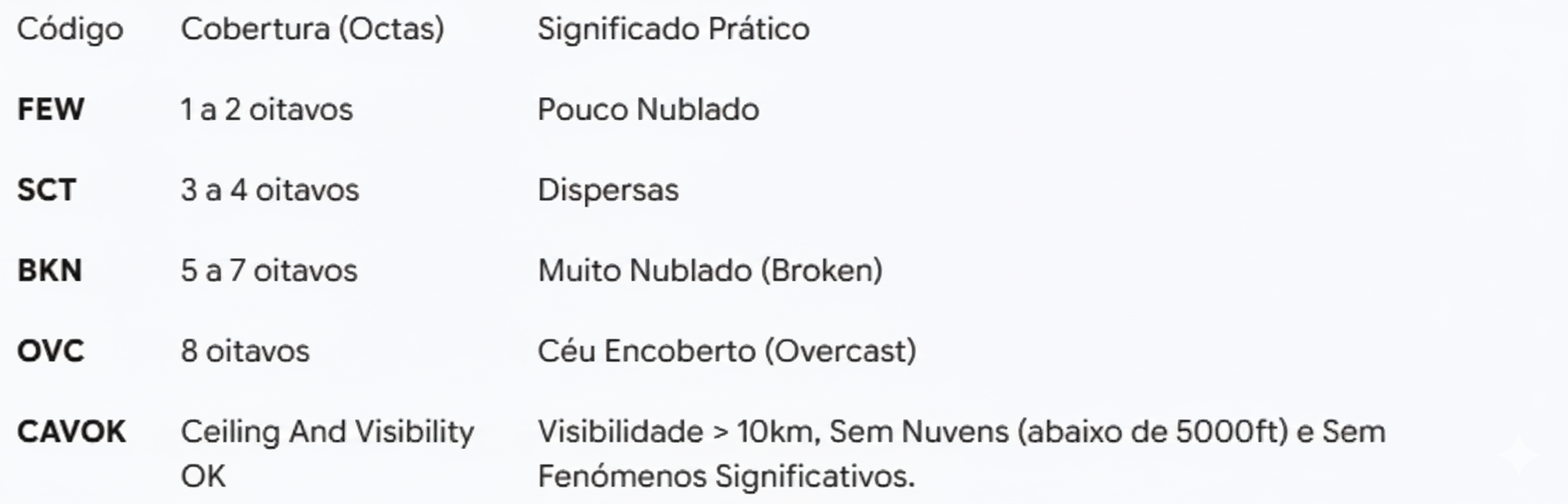 As nuvens são reportadas em oitavos (Octas). A altura é sempre dada em PÉS (Feet), multiplicada por 100.
