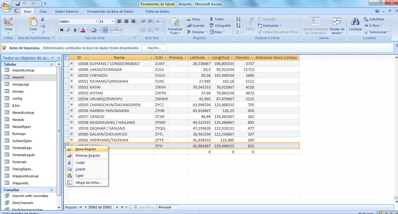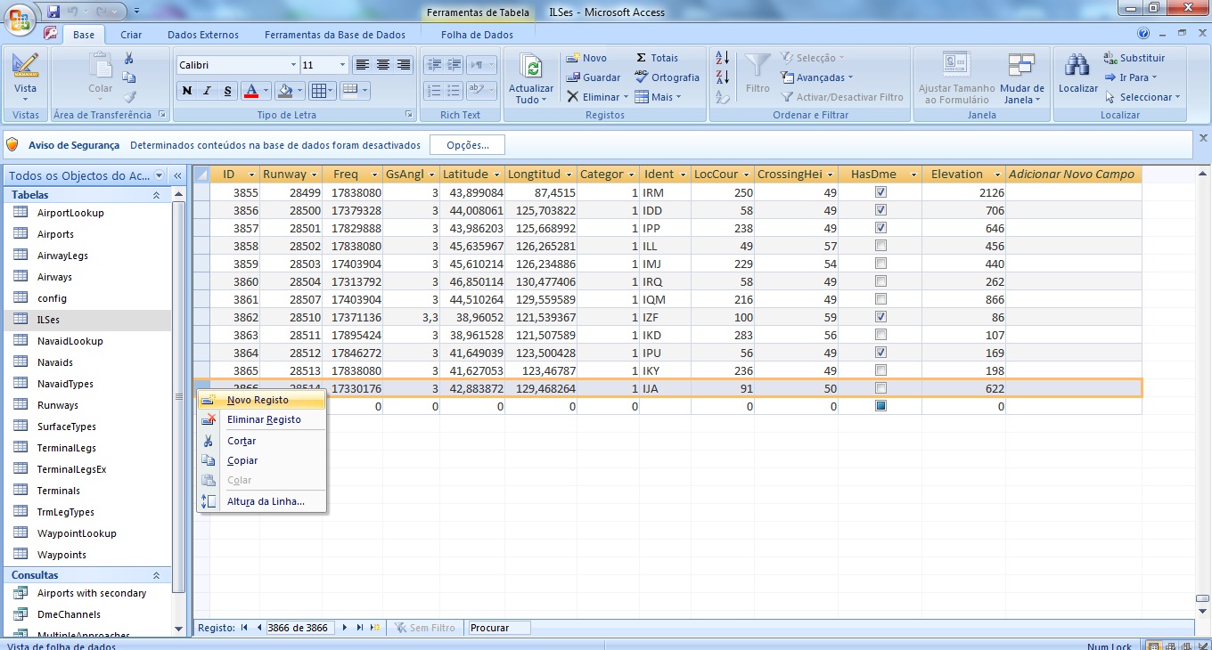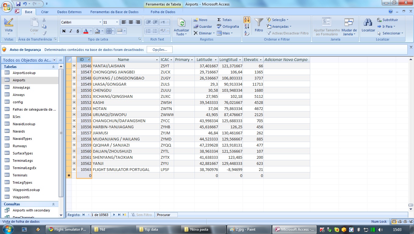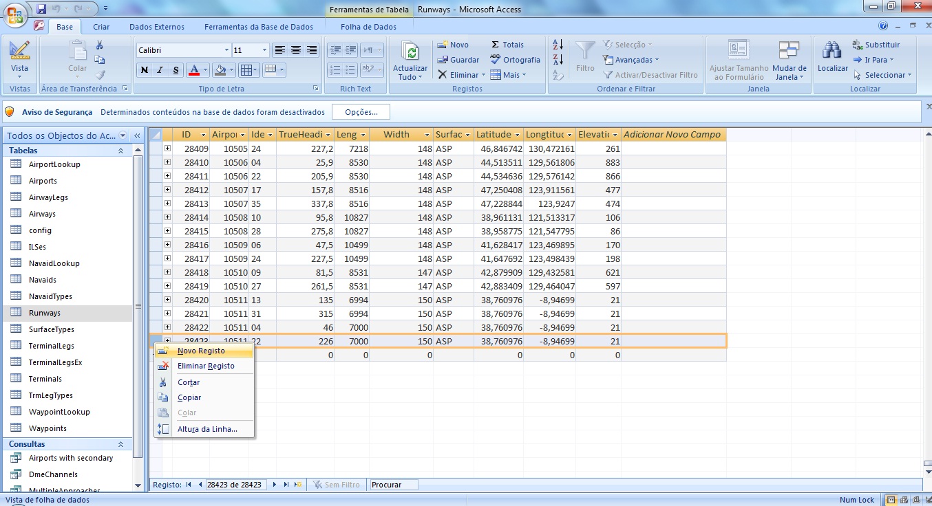 Na pasta "raiz" do FSX ir a FeelThere/Nd/ e abrir o ficheiro nd.mdb com o Access do Microsoft Office.