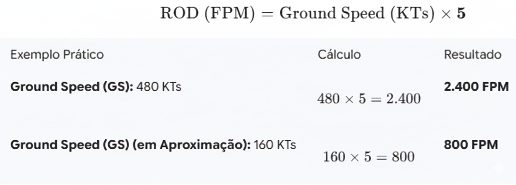 O ROD (em Pés/Minuto - FPM) necessário para manter o ângulo de 3 graus é calculado pela sua velocidade de solo (*Ground Speed - GS*).